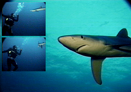 When his dive partner begins to feed the sharks bits of sashimi, the sharks crowd in. Morris pushes a button, and the sharks instantly scatter like a pack of cats with tails on fire.